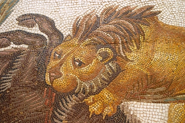 Een indrukwekkende leeuw op een mozaïek in de beroemde Villa Romana del Casale, niet ver van de stad Piazza Armerina in centraal Sicilië.