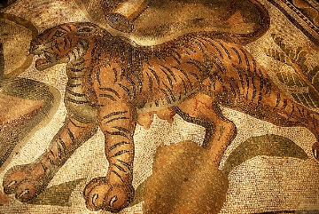drie schitterende mozaïeken met grote wilde dieren, uit de Villa Romana