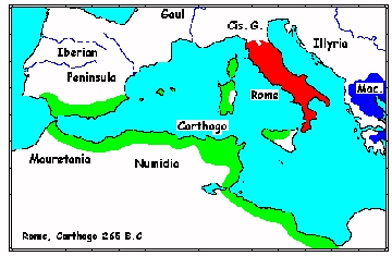 De invloedssferen van Rome en Carthago vóór het begin van de Punische oorlogen (helft 3de eeuw v.Chr.)